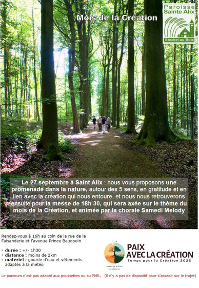 Vous êtes invités à une promenade dans la nature le samedi 27 septembre en gratitude et en lien avec la Création qui nous entoure, elle sera suivie par une messe à Sainte Alix à 18h 30.